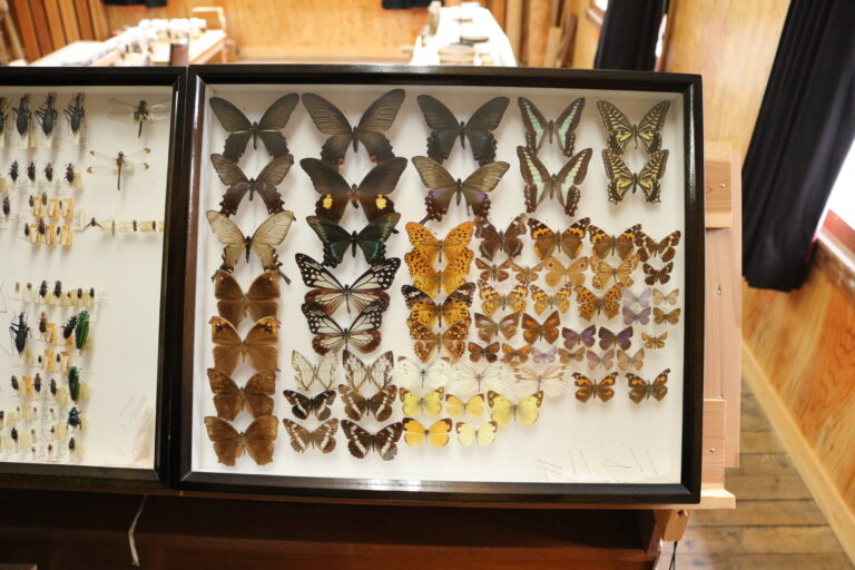 Another distinctive feature of the Wakayama Experimental Forest is its wooden administrative building, constructed in 1927. This two-story Western-style building, with its striking blue roof and white walls, was designated as a National Tangible Cultural Property in 2013. Equipped with lecture rooms and accommodation facilities, it serves as a base of operations for researchers and students. The building’s reference room displays insect specimens and stuffed animal specimens of species that inhabit the forest, as well as specimens of various trees. With leaves, branches, bark, and fruits that comprehensively represent the region’s vegetation, the building serves as a hub that helps pass forest knowledge on to future generations, utilized not only for student educational training but also for experiential learning programs for elementary students and the general public.