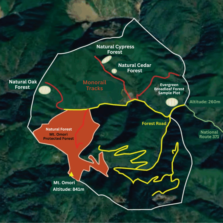 A notable characteristic of the Wakayama Experimental Forest is its range of elevations. The forest entrance sits at 260 meters above sea level, while the summit of Mt. Omori, the highest point, is at 841 meters, an elevation difference of approximately 600 meters. Given that steep slopes exceeding 30 degrees cover 70% of the area, monorails are utilized for efficient movement throughout the mountain. Laid on the steep slopes are four monorail lines totaling three kilometers in length, with railway cars that slowly climb through the trees while receiving sunlight filtered through leaves.