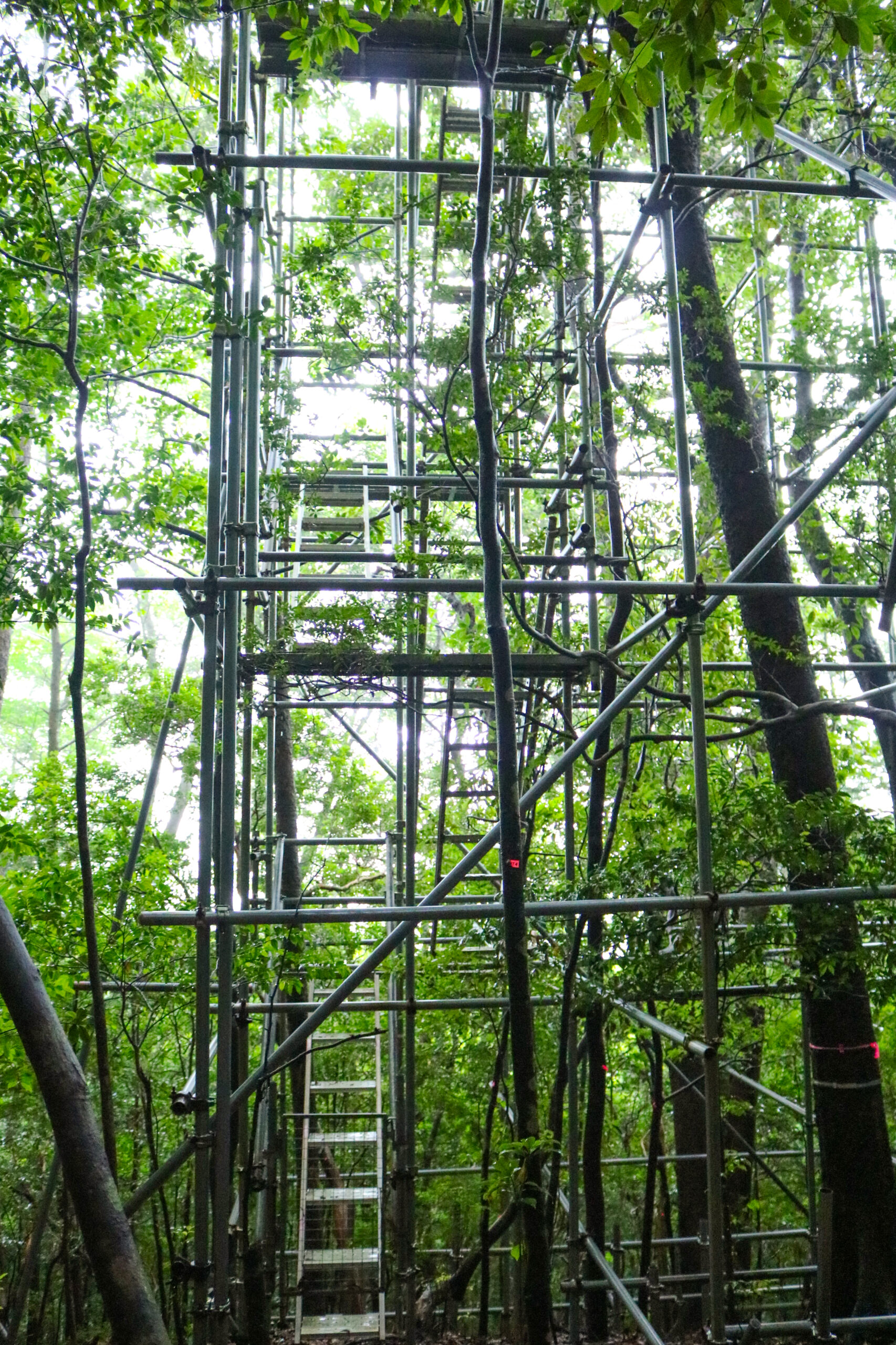The warm, humid climate and steep terrain create forest ecosystems that differ completely from those in Hokkaido. This forest supports research in numerous fields, including forest ecology, with a variety of observation equipment installed within it. One such structure is the “jungle gym.” Resembling children’s playground equipment but built as tall, massive scaffolding, it was installed to provide researchers with easy access to the tree crowns. It is used for monitoring tree growth by enabling evergreen broad-leaved tree leaves to be observed from above and litter traps to be installed for the collection of fallen leaves.