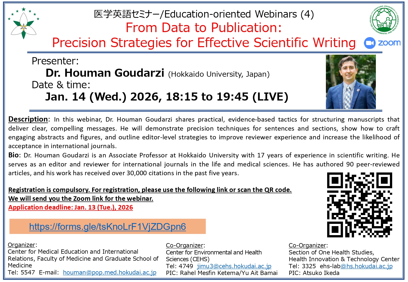 Faculty of Medicine’s Center for Medical Education and International Relations will hold a webinar by Dr. Houman Goudarzi from Hokkaido University. In this webinar, Dr. Goudarzi will demonstrate precision techniques for sentences and sections, show how to craft engaging abstracts and figures, and outline editor-level strategies to improve reviewer experience and increase the likelihood of acceptance in international journals.