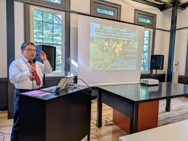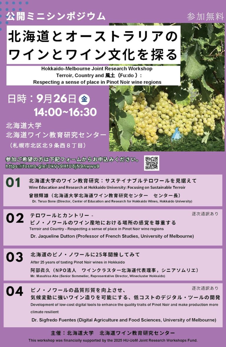 On the 26th of September, University of Melbourne (UoM) academics in Wine Studies visited the Center of Education and Research for Hokkaido Wines at Hokkaido University (HU) and held the HU-UoM Workshop – Terroir, Country and Fu:do (風土): Respecting a sense of place in Pinot Noir wine regions. This workshop was jointly organized by two enthusiastic wine experts: Professor Teruo Sone, Director of the Center and a member of the Research Faculty of Agriculture at HU; and Professor Jacqueline Dutton, Professor of French Studies and Co-Chair of the Sustainability and Climate Change of the Global Humanities Alliance in the Faculty of Arts, UoM. It was a kick-off event to connect academia and wine regions in Victoria and Hokkaido, where global warming has caused significant changes in recent years.