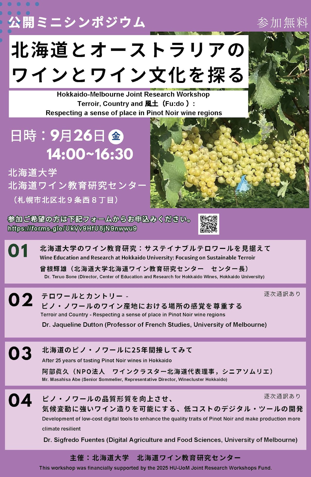 On the 26th of September, University of Melbourne (UoM) academics in Wine Studies visited the Center of Education and Research for Hokkaido Wines at Hokkaido University (HU) and held the HU-UoM Workshop – Terroir, Country and Fu:do (風土): Respecting a sense of place in Pinot Noir wine regions. This workshop was jointly organized by two enthusiastic wine experts: Professor Teruo Sone, Director of the Center and a member of the Research Faculty of Agriculture at HU; and Professor Jacqueline Dutton, Professor of French Studies and Co-Chair of the Sustainability and Climate Change of the Global Humanities Alliance in the Faculty of Arts, UoM. It was a kick-off event to connect academia and wine regions in Victoria and Hokkaido, where global warming has caused significant changes in recent years.