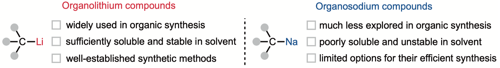 Highly reactive organometallic reagents, like organolithiums (molecules with a carbon–lithium bond) are essential reagents in organic synthesis because of their applications from polymer synthesis to pharmaceuticals, and more. Lithium resources, however, are difficult to access because concentrated deposits are geographically restricted and modern extraction methods are burdened with environmental costs. Replacing lithium with sodium would be a significant contribution towards environmentally friendly organic synthesis because it is >1000 times more abundant and its extraction from seawater is sustainable and inexpensive.