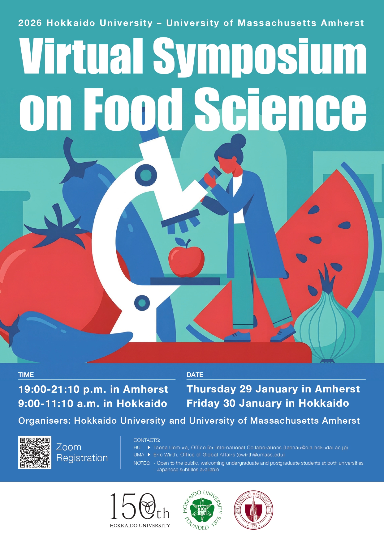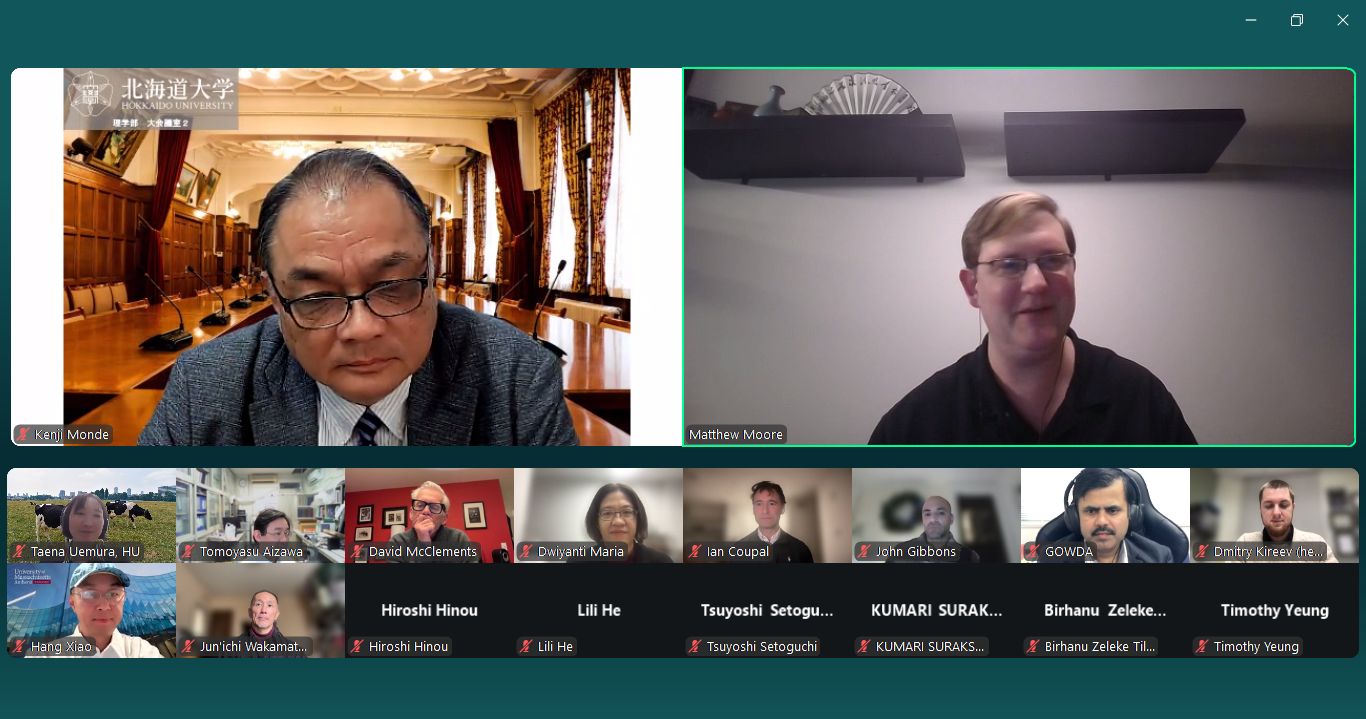 On the 30th of January 2026, Hokkaido University (HU) and its strategic international partner, the University of Massachusetts Amherst (UMass Amherst, UMA), held a virtual symposium on Food Science. In the past two years, the two universities jointly organized symposia on Polymer Science and Engineering and Geopolitics.